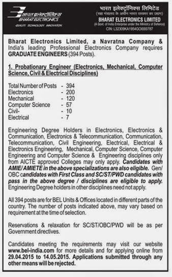 Job Description: Bharat Electronics Limited (BEL) requires Graduates Engineers for recruitment of Probationary Engineer for fill up 394 Vacancies in Electronics, Mechanical, Computer Science, Civil & Electrical Disciplines. Online Registration start from 29th April 2015 and close on 14th May 2015.
